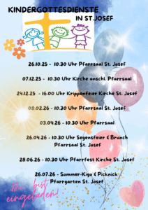 Die Kindergottesdienste im Pfarrverband finden etwa alle 4 bis 6 Wochen statt. Alle Kinder sind herzlich eingeladen, die Freude haben, mit Klein (Krippe/Kindergarten) und Groß (Grundschule) Gottesdienst zu feiern. Die Kindergottesdienste finden in der Regel am Sonntag um 10:30 Uhr im Pfarrsaal St. Josef bzw. in Maria Himmelfahrt statt.